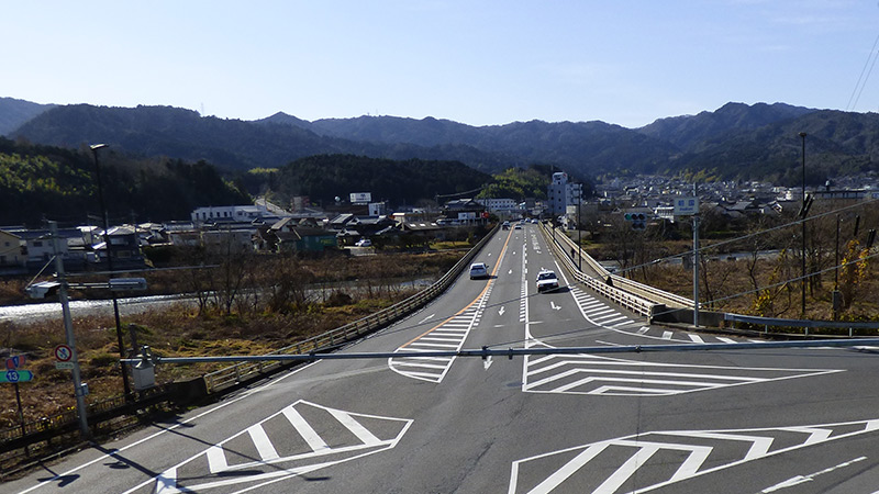 横田橋。横田の渡しの今の姿になりますかね。この橋の片側に歩道が付いているので、そこを渡りました。結構、車が通ってますね。写真は、渡った水口側から振り返って撮ったもの。歩道橋の上からね。