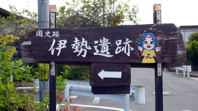 邪馬台国の跡ではないかと言われている伊勢遺跡。そこへの案内板。このキャラは卑弥呼でしょうかね。
