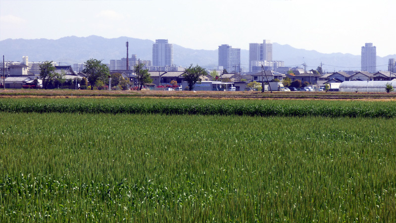 これ、詠んだときは、神社を背にした方向は、一面の麦畑だったのかなぁ。今は、旧街道の両側は家がず~っと続いて、想像の世界にだけ広がって...、と思っていたのだけど、この日の午後から歩いた志那街道で、これかなっていう風景があったので、写真掲載しました。大宝神社から北西へ直線距離で2キロくらいのところ。部分的にじゃなくて、結構、広がってましたね。芭蕉翁のときから、継続して麦畑なのかな??