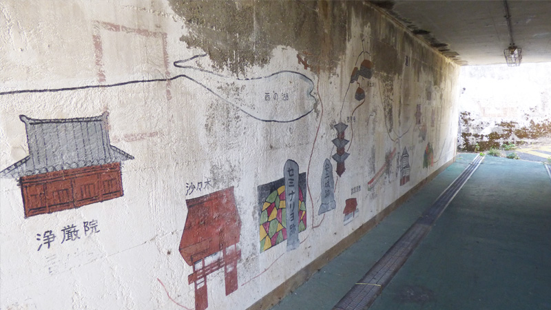 旧街道は老蘇を出たら、国道8号線と合流。その国道を横断する地下道には、安土町の案内図。たぶん、小学校か中学校の生徒の作品だろうか。