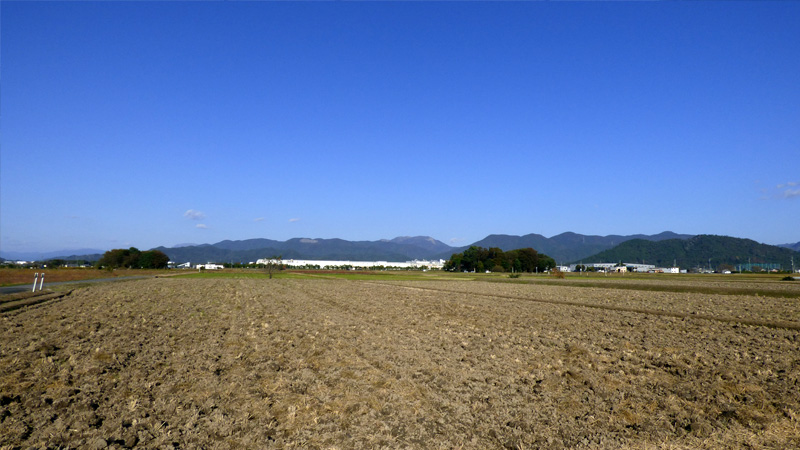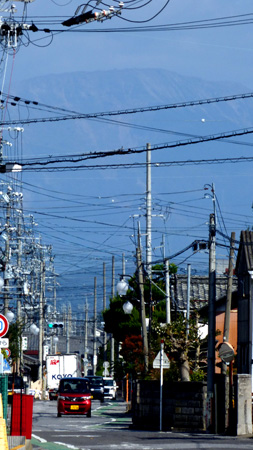 愛知川宿で、宿場を抜けたら、真正面に伊吹山が見えるというので、期待していたんですけど、よくよく見ると、いつの間にやら見えてますね。伊吹山ですよね。 「でかいね。」