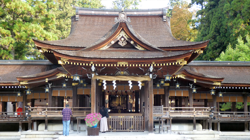 建物...だけど、左右も広がっているし、奥行きもあるね。写真正面が、拝殿。その両脇から長い袖回廊が翼を広げている。拝殿奥に神楽殿。その奥に幣殿。ここからも、左右に翼廊が出ている。「回廊が二重になっているから、すごく奥行きが出ているのかな。」 その奥に、祝詞舎。その奥に、本殿。