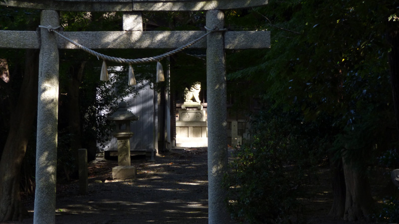 街道から入ったところにある一の鳥居からの望遠の写真。写っているのは二つ目の鳥居。「狛犬さん、光ってるね。」 車が、ぶんぶく通っている街道のすぐ横とは、思えないね。