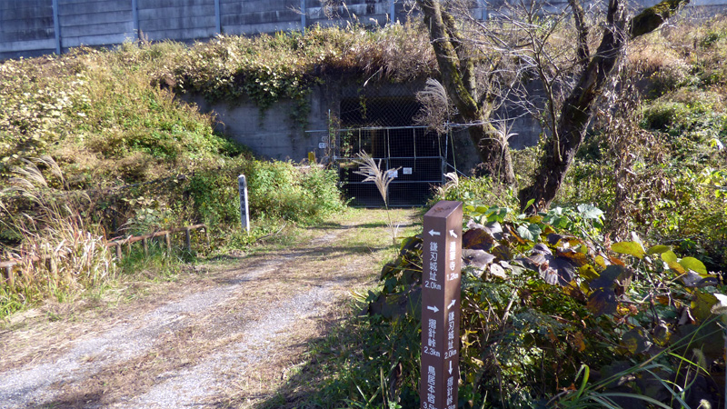 中山道の横を名神高速道路が、通っていて、写真はその高速道路の高架下をくぐるトンネル。手前には、鎌刃城への道しるべ。トンネルには、フェンスがしてあり、チェーンが引っかけてある。ボードが3つ。2つには、開けたら必ずしっかり閉めてチェーンを掛けてください、とのこと。