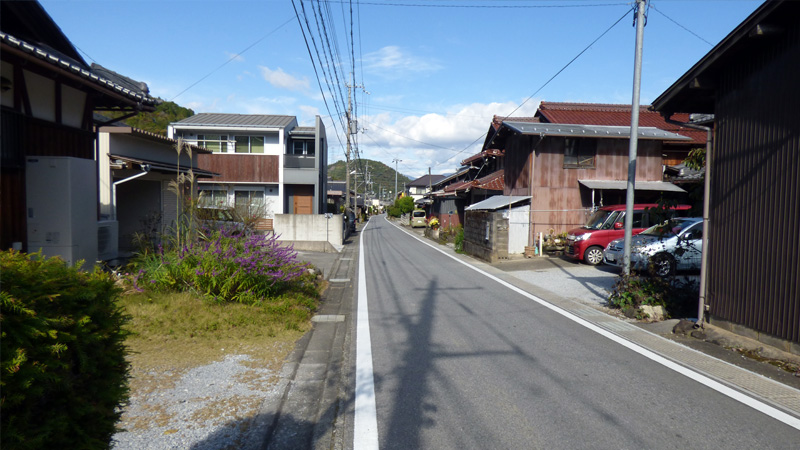 なんか、いいね、この宿場。まっすぐ続く道の先に、ぽっこりと、お椀を伏せたような山がひとつ。「日本昔話に出てきそうなところだね。」