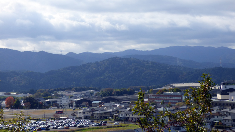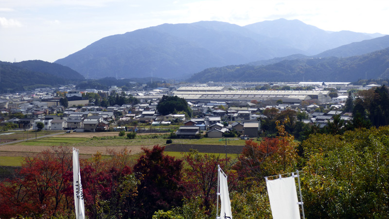 写真中央の工場の屋根の上に見える手前の山が、小早川秀秋が陣取った松尾山。「結構、遠いんだね。」 そうだよね。望遠レンズで覗けば旗差し物が見えるけどね。
