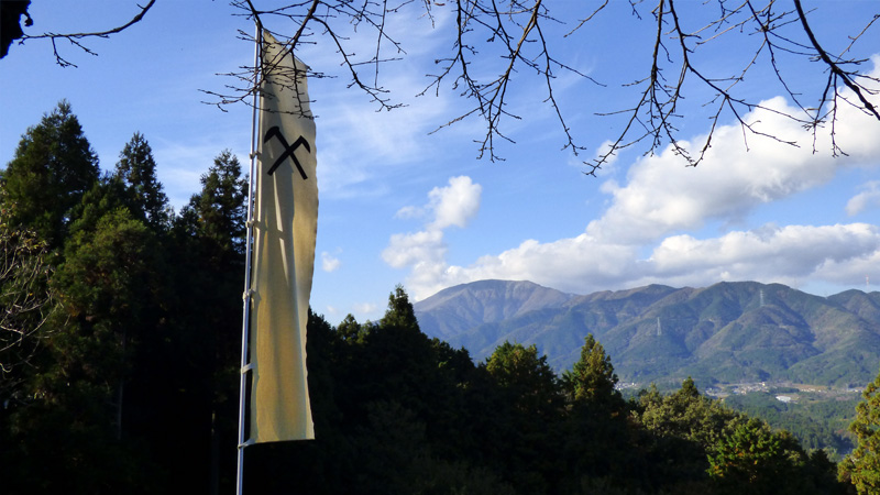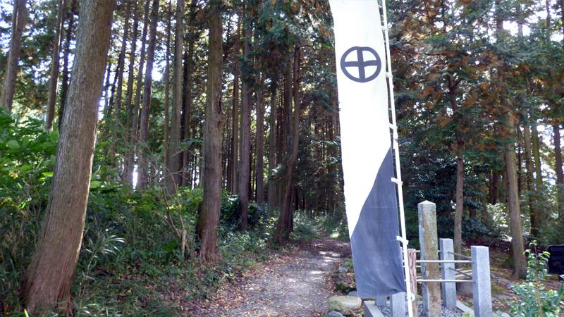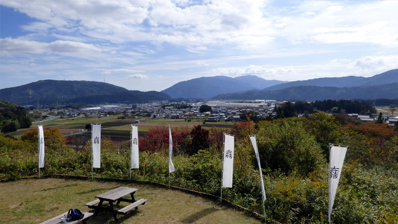 松尾山、小早川秀秋の陣跡。旗差し物の後ろは、伊吹山。