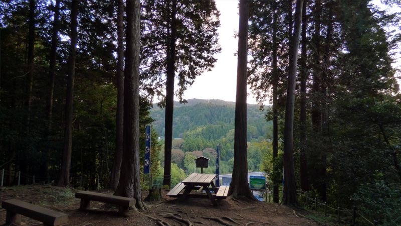 樹間に見える山の稜線の奥から二つ目、小さく白い旗が立っているところが、小早川秀秋の陣所。「結構近いけど、山を下ってきたら即吉継の陣所じゃなくて、谷間を挟んで随分登らないといけないんだね。」
