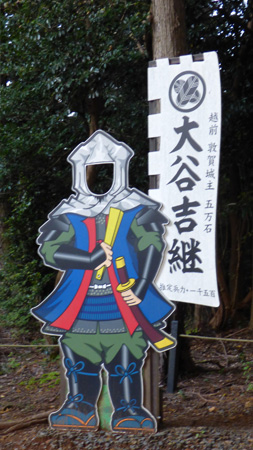 「いやいや、大谷吉継は病のため、顔が崩れていて、それを白い布で覆って隠していたとされているが、それを逆手に取っての顔ハメ看板、さすがだね。」 看板置いたのは、観光かの人じゃないの?