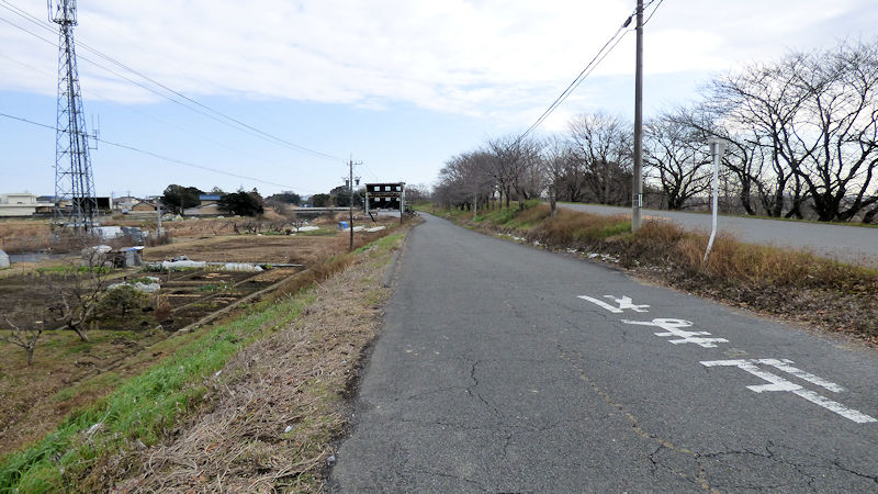 三回り半のところで巨大な堤防に突き当たり、堤防にそってしばらく進み、写真はその堤防を越えて、反対側に下る道。「遠くに、平野井川を渡る橋が見えるね。」