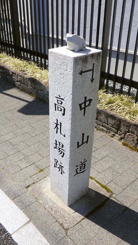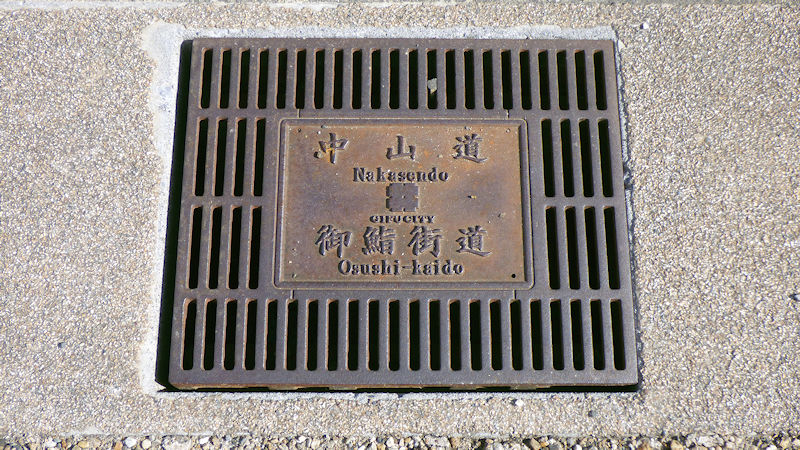 「脚元に、何か、書いてあるけど?」 ん? 溝蓋?…、雨水を流すグレーチング?…って、中山道って、書いてあるよ。いいね。