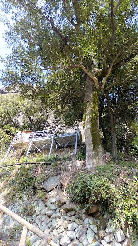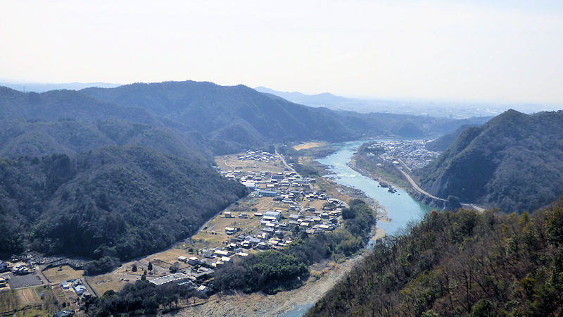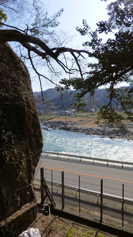 今、立っているのは、坂祝町の街が広がっている木曽川右岸の堤防上の中山道。対岸は、平野部分が全くなく、川から、いきなりの急峻な山。さらに、ところどころ、木々から岩が、そそり立っている。「まるで、何かの守護神。」