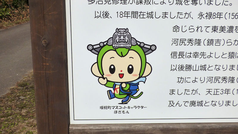 「おっ!案内板があるね。親切だね。この城跡、キャラクターもいるの?」城跡の…じゃなくて、ここ、坂祝(さかほぎ)町のキャラクターだね。