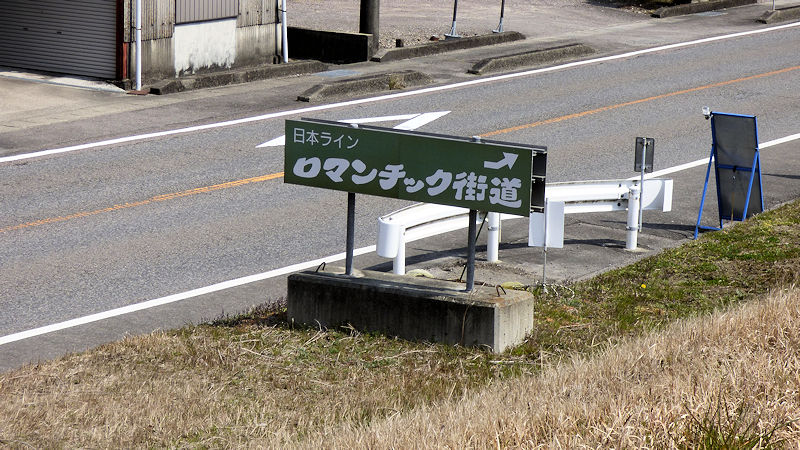 「何?あの看板?」ロマンチック街道…って、あるね。矢印が斜め右上指してるから、たぶん、今歩いてる、この道のことなのかな?