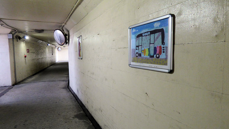 「でも、ここの地下道、イイね。これ、地元の小学生の絵かな?」そのようだね。地下道が、明るくなって、イイね。