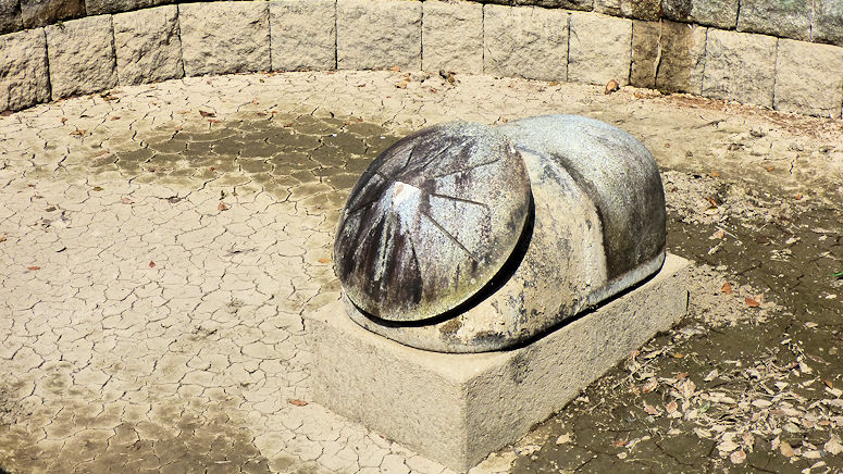 「水が、スッカラカンに干上がった池に、石の造形物。何だろね?」案内板には、田植え…と、あるね。