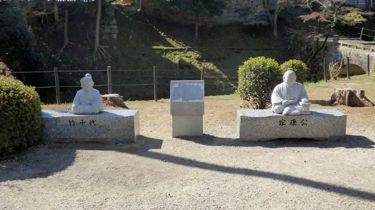 「これは…、また…、凝ってるね。」 幼い頃の家康公:竹千代くんと、天下人の家康公それぞれ、ベンチ中央に置き、二人で挟んで腰掛けて記念撮影なんだね。