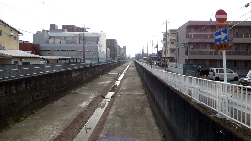 深田橋。「…って、どこにあるの?」写真中央で信号待ちしている車列の向こうに、欄干みたいなのがあるでしょ。「ホントだ。用水路のような川?」そう、旧街道の下をくぐってるね。
