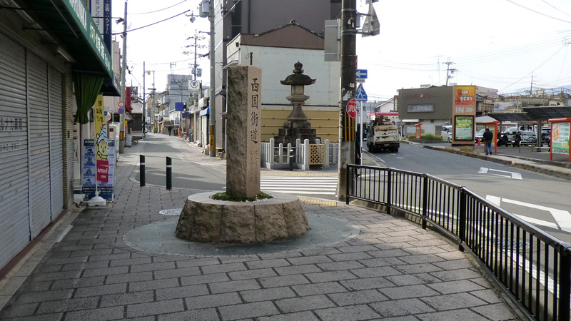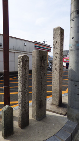 手前の大きい西国街道の石碑は、新しいものだけど、奥の角に立つ常夜灯は、江戸時代の天保期に、伊勢参りの講、築榊講によって建てられたもの。