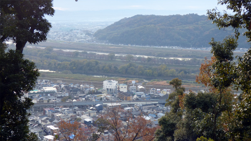 天王山の上からの眺め。大阪平野の方向。中央を蛇行しているのが淀川。左上の山は生駒の山系。中央の遠くに見えるのは、泉州の山並みだろうか。右の方で、デコボコしているのは、大阪市内のビル群。