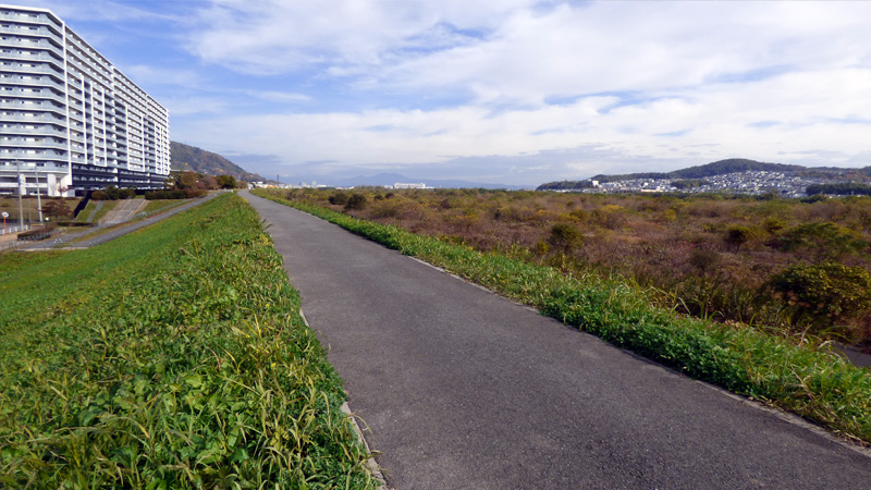 高浜砲台の碑から、淀川堤防に上がったところ。実際の砲台は、今の河川敷にあったとか。右前方の小高い丘のように見えるのが、石清水八幡宮のある男山。写真中央遠方に見える青い稜線が比叡山。