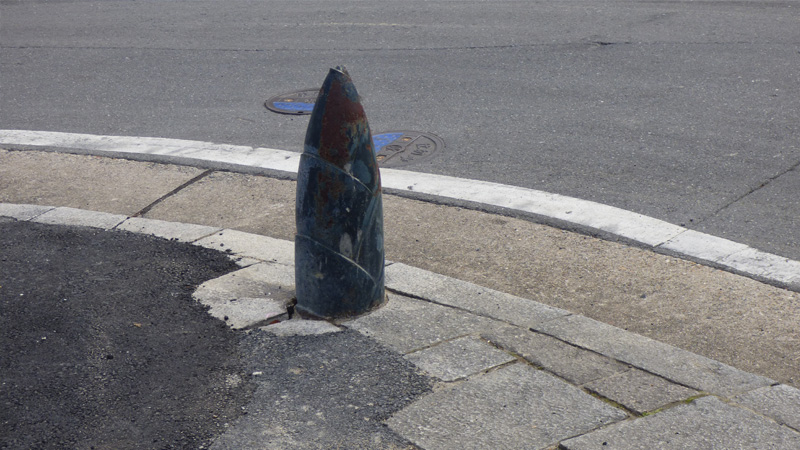 おっ? こんなところに筍が生えてると思いきや…。「そんなわけ、ないでしょ。歩道のパネルを突き破ってるし。」 でも、よく見て。パネルの間、ひび割れているし、アスファルトで補修してあるでしょ。これ、次々と筍が出てくるせい?「…。」