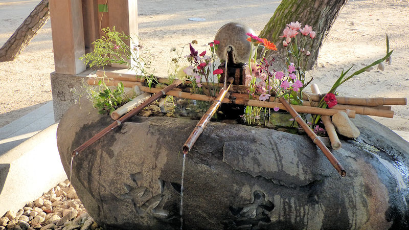 「ほ〜、お花が生けてあるね。」 そうだね。境内は、誰もいないんだけど、ご丁寧に、お出迎えを受けたような気持ちになるね。