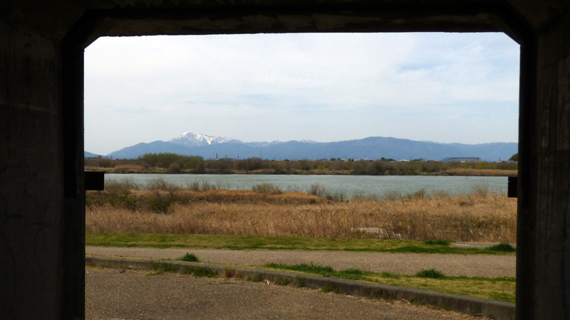 陸閘から望む木曽川と伊吹山。「あの大きな伊吹山を中に入れて、こうして見ると、陸閘って、大きく頑丈に見えるね。」