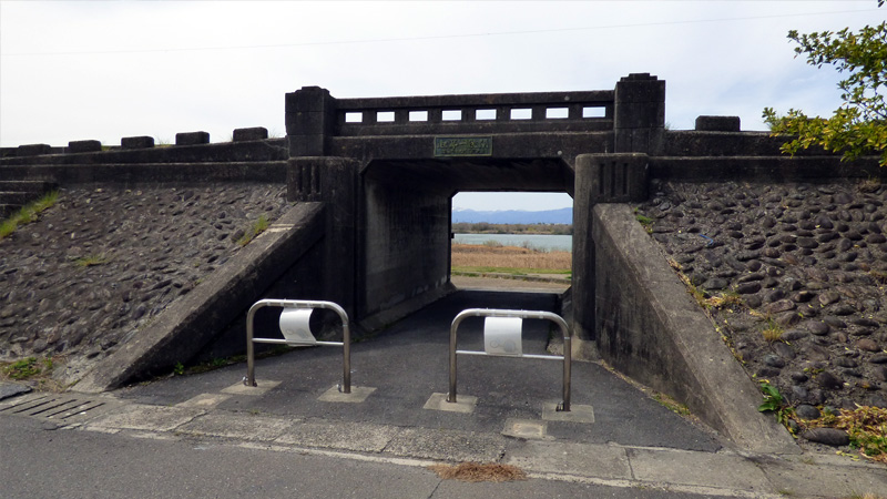 「陸閘って?」 堤防を切って、河原への出入りをしやすくしたところ。もちろん、川の水が増えると、門を閉めて、堤防外への浸水を防ぐ。