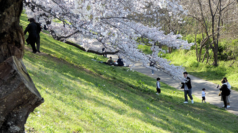 閑静な住宅地の中にある公園だけど…。「人、多いね。中に入ると、花もいっぱい。」
