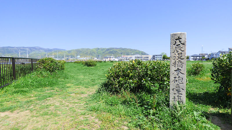 先ほど通った淀小橋跡の碑が、橋の北詰で、ここが南詰って感じ。両方の碑の間は、170メートル。碑に記載のある川幅は、556尺5寸だから、ちょうど、合ってるね。