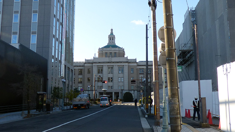 民家の家並みが続く京町通り、信号で止まって、横を見ると...、なんといきなり場違いのような建物! 県庁本館です。上に塔があるし、一瞬、国会議事堂かと。「そんな、あほな...」 ...いっそ、町屋風にしたらよかったのに。(失礼 m(_ _)m)