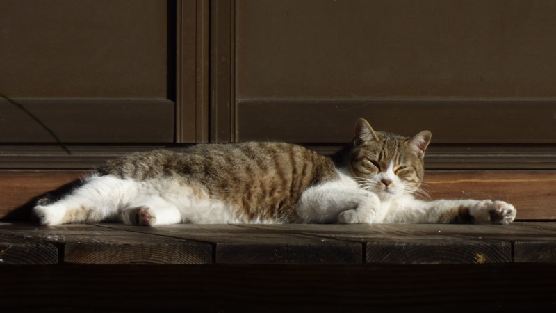 石坐(いわい)神社の近くの桃源寺で昼寝していた猫くん。このあたりの旧東海道は、大津市の街なかの生活道路という感じなので、近所の人しか通らないのか、のんびりした感じ。