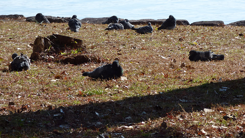 湖岸道路を渡って、琵琶湖にぽこっと突き出している膳所城跡公園。ゲートボールをしている人たち以外は、散歩している人が数人。住宅地とつながってないので、人も少なく、寒いけど、鳩もまったり。
