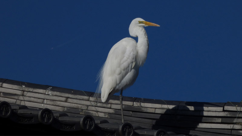 またまた膳所城公園。「なかなか進まないね。」...主なき城の家紋が入った瓦の上で、門番のように鷺が周りを警戒中。ところで、本多家の家紋は、三つ葉の立葵。ほ~、徳川家の家紋と似てますね。