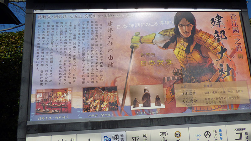 近江の国一の宮の建部神社。由緒を記した大きな看板ですが、何かインパクトありますね、イラストが。祭神は、日本武尊。