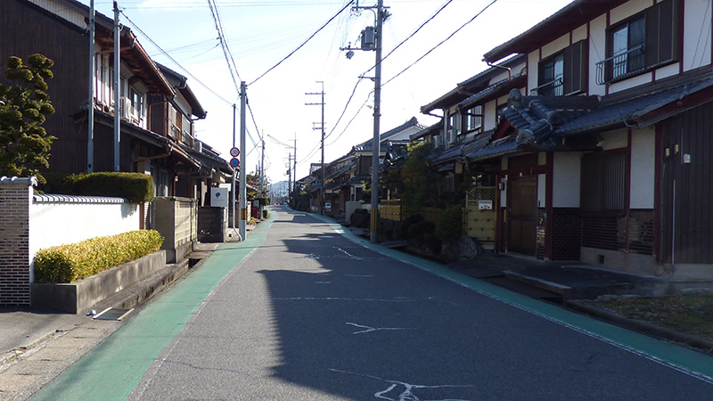 水口に向かってまっすぐに伸びる道。昔は田んぼの中の一直線の道:縄手道で、美しい松並木が続いていたとか。近隣の村々に掃除場所が割り当てられていたそうなので、美しいはず。