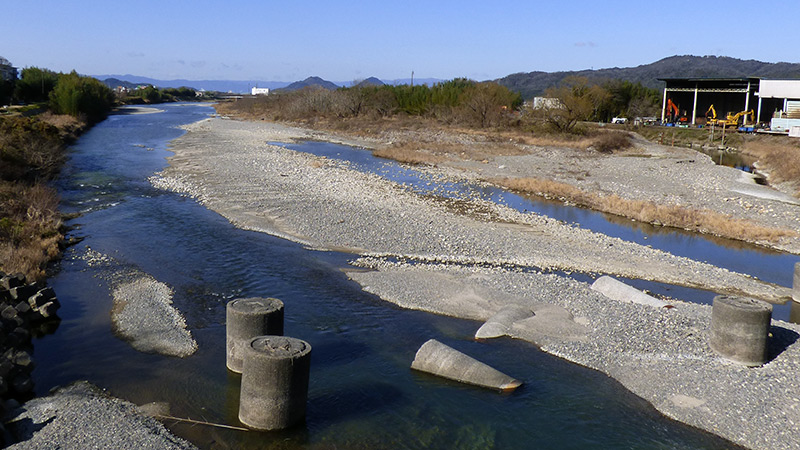 横田橋に立って、下流を見たところ。大きなコンクリートの円柱が、豪快に転がっています。昭和4年にできた前の橋の橋脚のようです。インパクト強すぎ。芸術作品みたい。