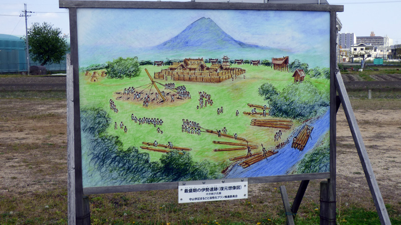 邪馬台国の跡ではないかと言われている伊勢遺跡。そこへの案内板。このキャラは卑弥呼でしょうかね。