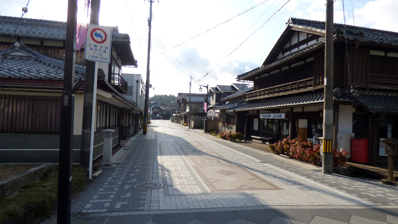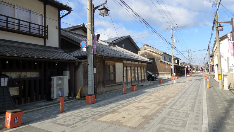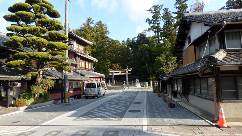 いや~、街全体、気合いが入ってますね。道路は、きれいにブロックで覆われているし、車道・歩道が明確に別れていて、車がスピード出せないように、ジグザクにしていて、そのスペースにあかり灯篭が設置してあってと。街全体が境内みたいな感じですね。