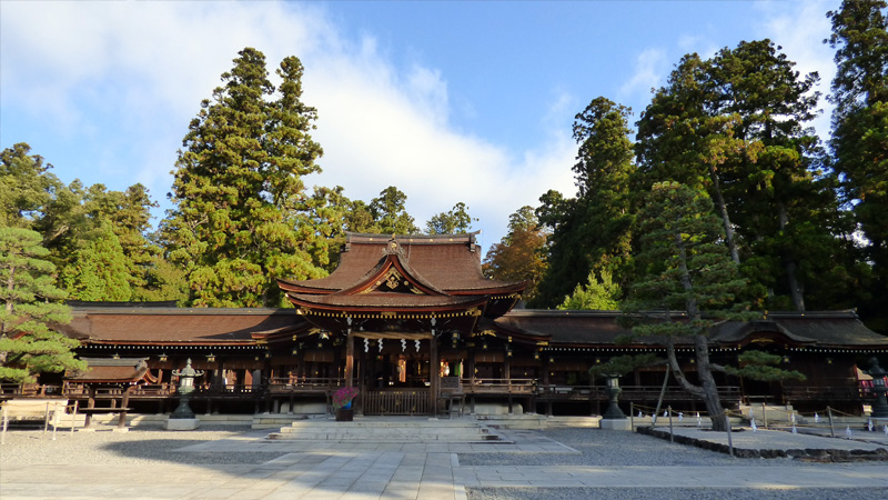 建物...だけど、左右も広がっているし、奥行きもあるね。写真正面が、拝殿。その両脇から長い袖回廊が翼を広げている。拝殿奥に神楽殿。その奥に幣殿。ここからも、左右に翼廊が出ている。「回廊が二重になっているから、すごく奥行きが出ているのかな。」 その奥に、祝詞舎。その奥に、本殿。