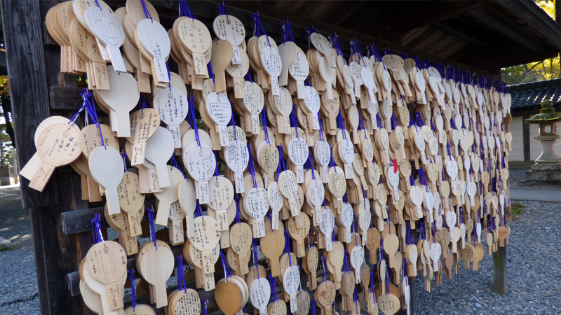 写真は、その杓子形の絵馬だね。「い~っぱい、掛けてあるね。この裏側も、同じだけ掛けてあるよ。」 ちなみに、帝に献上した杓子の残り木を、さしておいたら、根が生えて大木になったという。その木が今も少し離れたところにあるらしいよ。「樹齢、何年なの??」