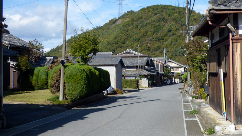 なんか、いいね、この宿場。まっすぐ続く道の先に、ぽっこりと、お椀を伏せたような山がひとつ。「日本昔話に出てきそうなところだね。」