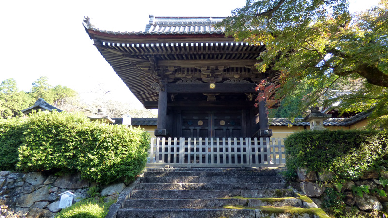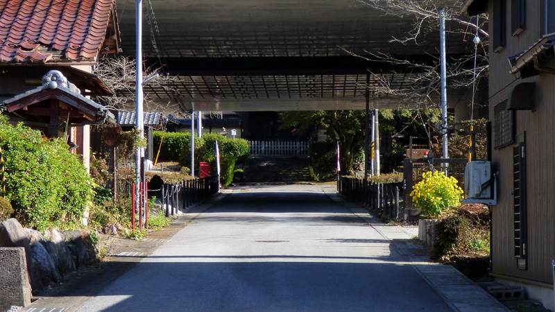 蓮華寺の前。上を横切っているのは、名神高速道路。正面は勅使門。