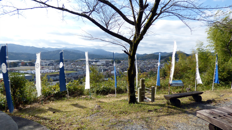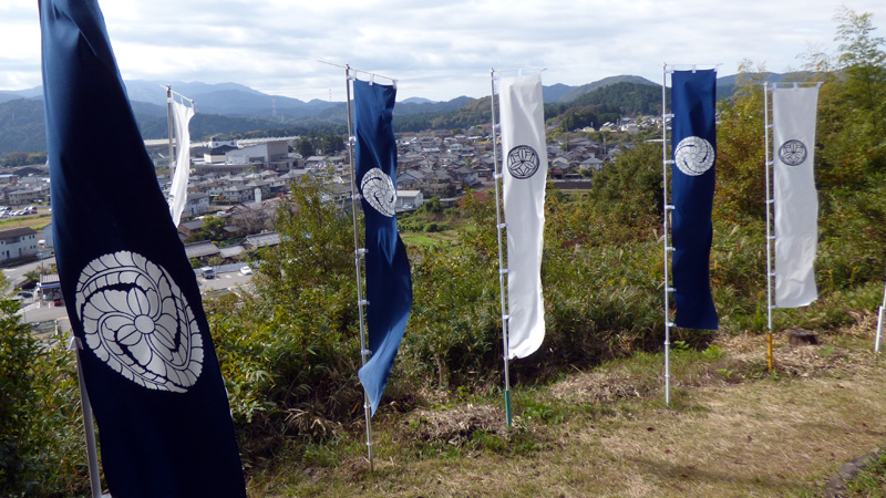 松尾山、小早川秀秋の陣跡。旗差し物の後ろは、伊吹山。
