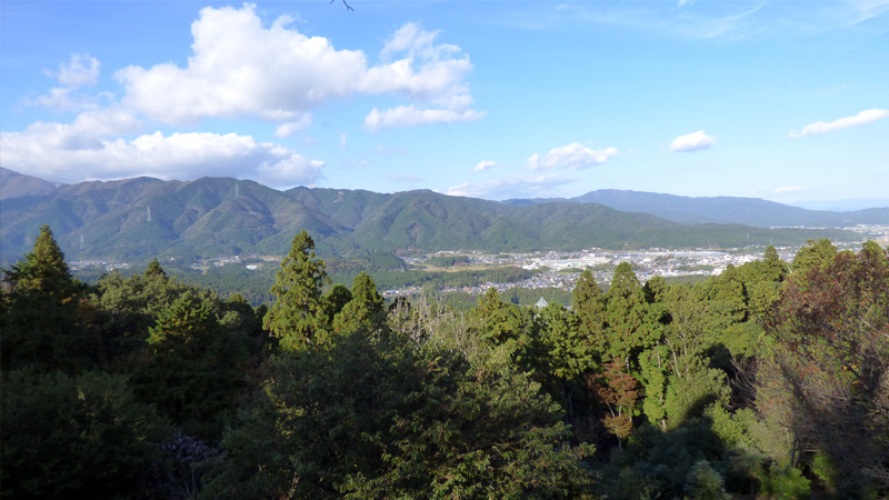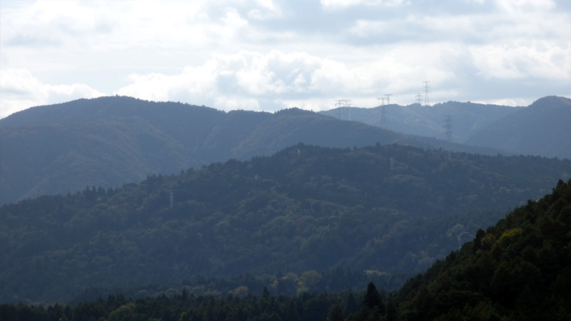 樹間に見える山の稜線の奥から二つ目、小さく白い旗が立っているところが、小早川秀秋の陣所。「結構近いけど、山を下ってきたら即吉継の陣所じゃなくて、谷間を挟んで随分登らないといけないんだね。」