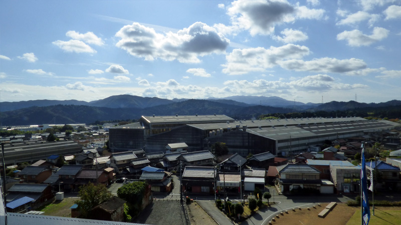写真中央の工場の屋根の上に見える手前の山が、小早川秀秋が陣取った松尾山。「結構、遠いんだね。」 そうだよね。望遠レンズで覗けば旗差し物が見えるけどね。