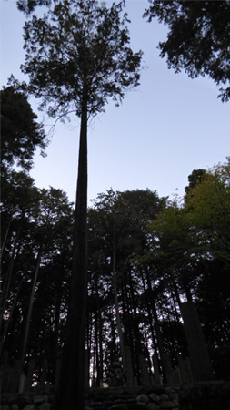陣跡から山奥へ5分ほど行ったところ。いや~、山の中の夕暮れは、なんとも怖いね。刻々と塚も山も木々も大きくなっていくような感覚を受けるね。墓のまわりの木々は、直立不動。まるで刑部卿の従者のような。「スケール感、大きいね。」 さすがわ、西軍にその人ありと言われた大将だね。
