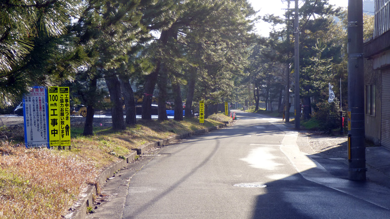 もう終わりかと思った並木道。交差点で一旦国道と一緒になって、すぐにまた脇道へ。そして今度こそ期待通りの並木道...、と、思ったら...。「思ったら?」工事中の黄色い看板が...。「まあ、仕方ないね。注意喚起だしね。」でもあと100m、あと50mって、必要以上に細かく立ててあるような感じ。これ、いやがらせじゃない?m(_ _)m