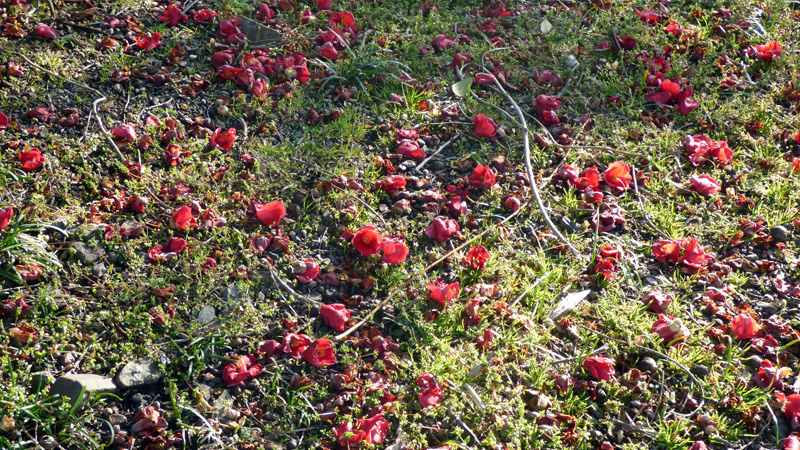 「お墓を隠していたのは、椿の木だったの?」 一面に、赤い椿。なんか、踏んだらいけないような気がして、ゆっくりと進んで、お参りしました。